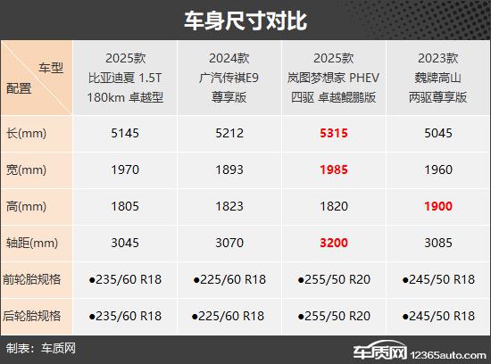 在车身长度方面,梦想家表现最为突出,在车身长度、车身宽度、轴距等方面保持领先,保证了车内乘客的腿部空间和横向空间足够宽敞。魏牌高山在车身高度上优势明显,1900毫米 车身高度可以充分保证车内乘客的头部空间,即使长途驾驶也不会有太大的压迫感。相比之下,比亚迪夏和传祺 E9 表现旗鼓相当,没有突出的亮点。另外,只有梦想家配置了 20 与其它三款车型相比,英尺轮毂具有更好的视觉效果。