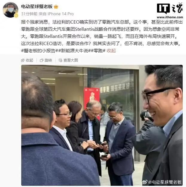 IT 世家 2 月 14 每日新闻,博主 @电子星球蟹老板 今天爆料说:“法拉利 CEO 的确,我参观了零跑汽车总部。这件事甚至比之前传出的零跑和世界第四大汽车公司还要好。 Stellantis 战略合作的消息也会爆炸。因为想象空间特别大。”