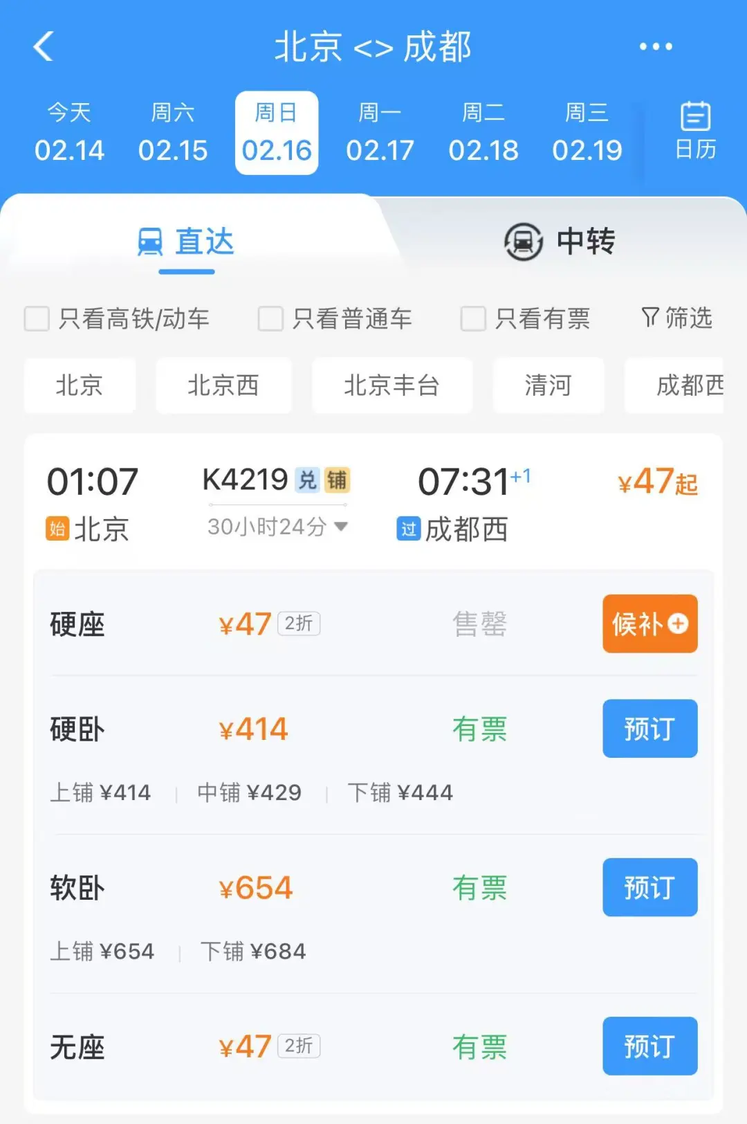 K4219次从北京到成都,最低票价只有47元。图片截获12306App。
