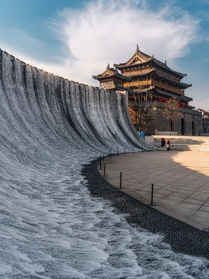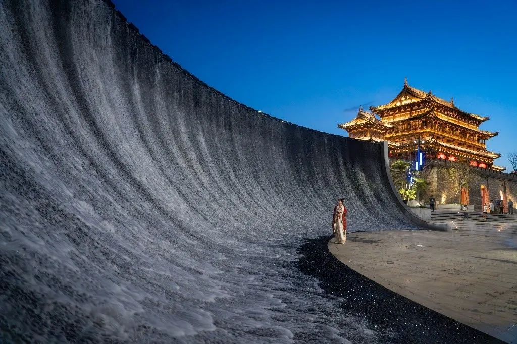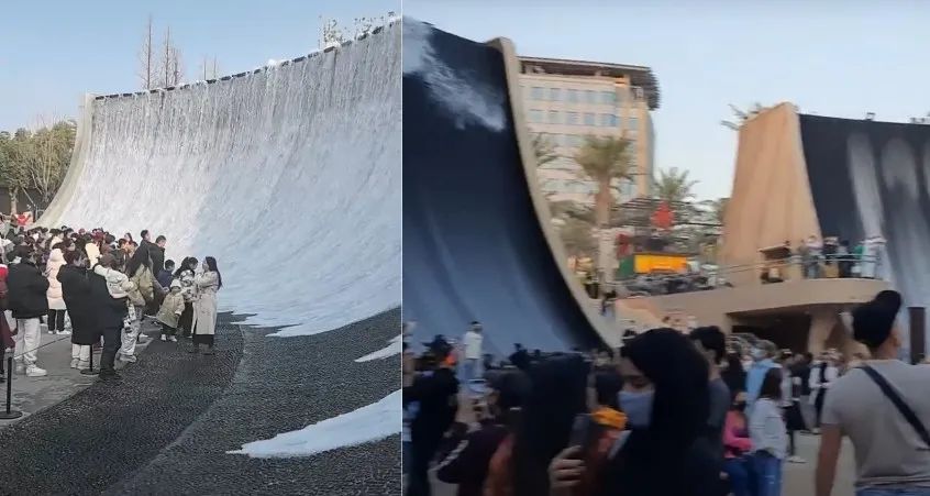 “潮墙”(左)和迪拜世博城,位于中国浙江省海宁市盐官潮乐之城。Surreal"水景瀑布(右)。