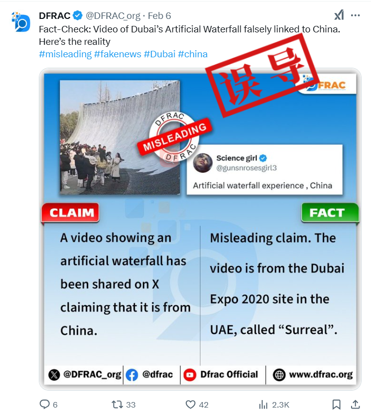 - 印度事实核查机构误以为网络视频显示的是迪拜的“Surreal”飞瀑,但实际上是在中国浙江海宁市盐官潮乐之地拍摄的。