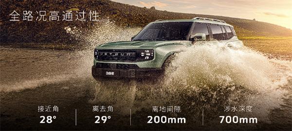 就车身长度而言,新车的长宽高分别是 轴距4706/1967/1845mm, 位于紧凑型2810mm SUV,接近角 28 度,离去角 29 度数,离地间隙 涉水深度达到200mm 700mm。