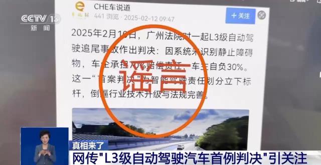 “L3级自动驾驶汽车首例判决”网爆引起关注 官方辟谣