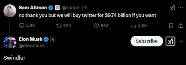 没想到,这句话很快引起了马斯克的直接反击。他直接在同一个平台上称奥尔特曼为“骗子”,为这次收购增添了一把火。