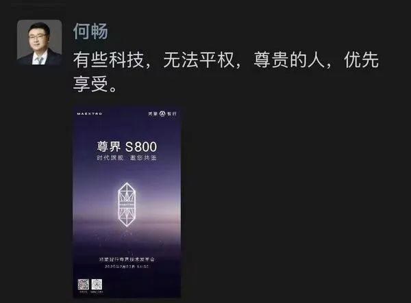 最近,一张关于“平等权利”的朋友圈截图在网上广为流传。图中,一位签名“何畅”的人声称,有些科技无法平等权利,尊贵的人优先。文末还配有尊界S800发布会海报——尊界S800是华为和江淮汽车共同打造的豪华新能源汽车,市场预测售价约100万元。