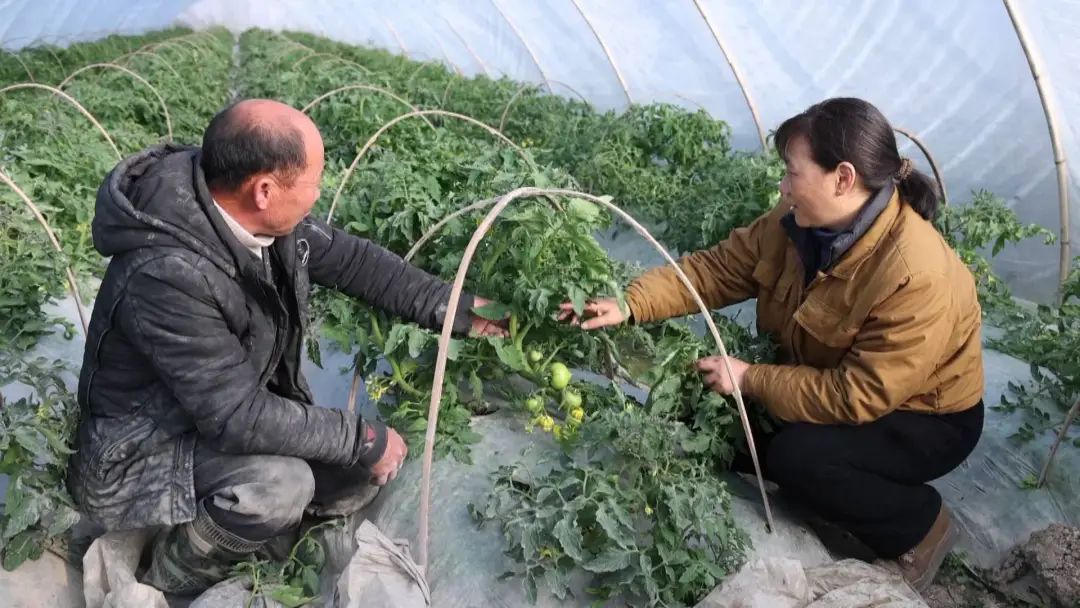 近日,在徽州区西溪南镇芝麻村温室,农业技术人员仔细检查番茄幼苗的生长情况,帮助农民在温室内增加多层保温膜,形成有效的保温层,抵御夜间低温。(徽州发布)