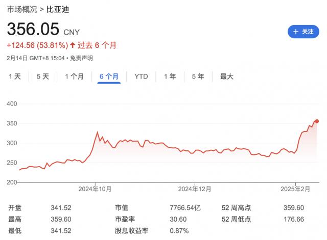 截至 2 月 14 比亚迪每天收盘 A 股报收 356.05 元,上涨 总市值达到4.32% 1.04 一万亿美元。比亚迪就是这样 A 股市值在 2022 年 6 月亮第一次突破万亿元后,再次站过万亿元大关。