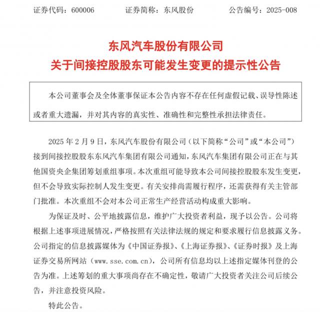 2 月 9 当天晚上,东风股份有限公司和长安汽车同时宣布,双方间接控股股东正在准备与其他国有企业集团重组。2 月 10 日本,东风汽车公司向媒体确认重组事项属实。