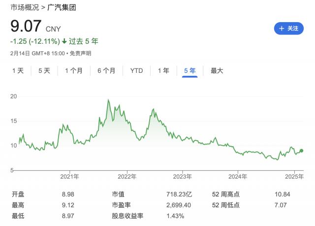 长期徘徊在市场低谷的广汽集团,最近股价迎来反弹,截至目前 2025 年 2 月 14 日收市场,广汽集团报收市场 9.07 元,上涨 1.0%,换手率 0.38%,成交量 27.84 万手,成交额 2.52 亿元。