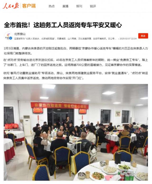 近日,内蒙古突泉县的天空刚刚变白,突泉县人力资源和社会保障局门口正准备出发两辆挂着“京蒙合作暖心返岗专车”横幅的公交车。“点对点”劳务输出进入北京欢送仪式后,45 一名在京工人统一乘坐“免费工作专车”,踏上返京返岗之旅。这次跨越 700 温暖的接力公里,见证了京蒙合作的深厚友谊。