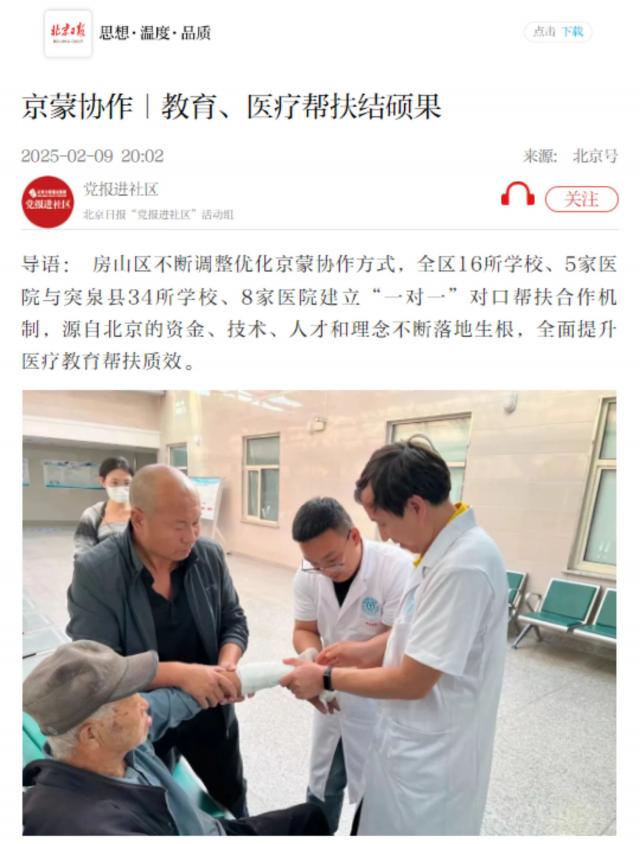 房山区不断调整优化京蒙合作模式,全区 16 所学校、5 家庭医院和突泉县 34 所学校、8 家庭医院建立了“一对一”对口帮扶合作机制,源自北京的资金、技术、人才和理念不断根深蒂固,全面提高了医疗教育帮扶的质量和效率。