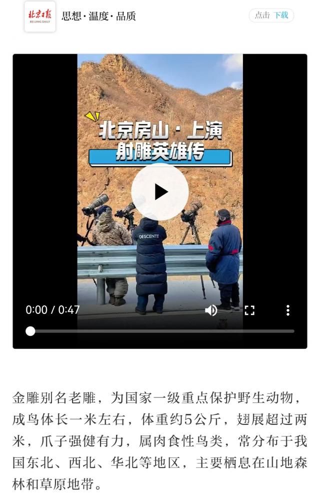 近日,在佛子庄乡红煤厂村,发现悬崖边活动着一对国家级保护动物金雕。金雕的出现不仅证明了房山生态环境的不断改善,也为野生动物的研究提供了宝贵的信息。