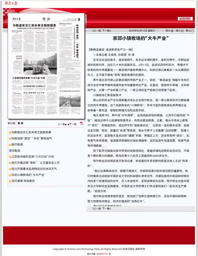 2 月 11 2008年,我走进窦店恒升畜牧养殖中心,这里有一个大型的肉牛养殖基地,养殖水平高。科技日报记者看到,一头强壮的牛正在慢慢“享受”面前食槽里的杂草。在窦店,围绕肉牛养殖,从科研到产业,从第一产业到第三产业,建立了立体的生产链。