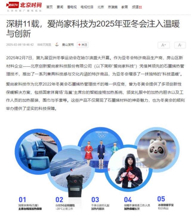 2 月 7 第九届亚洲冬季运动会在哈尔滨隆重开幕。房山区新材料企业北京创新爱尚家科技有限公司作为亚冬会特许商品制造商,凭借其领先的石墨烯热管理技术,推出了一系列兼顾现代感和文化底蕴的特许商品,为亚冬会增添了独特的“科技温暖”。