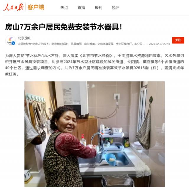 为深入贯彻“节水优先”治水政策,深入落实《北京市节水条例》,全面提高水资源利用效率,房山区水务局组织开展节水器具改装项目,参与 2024 城关街道、长阳镇、窦店镇等年节水型社区建设。 6 一条乡镇街道 49 一个社区,通过需求调查,共为 7 万余户居民精确改装高效节水器具 92615 套(件)。