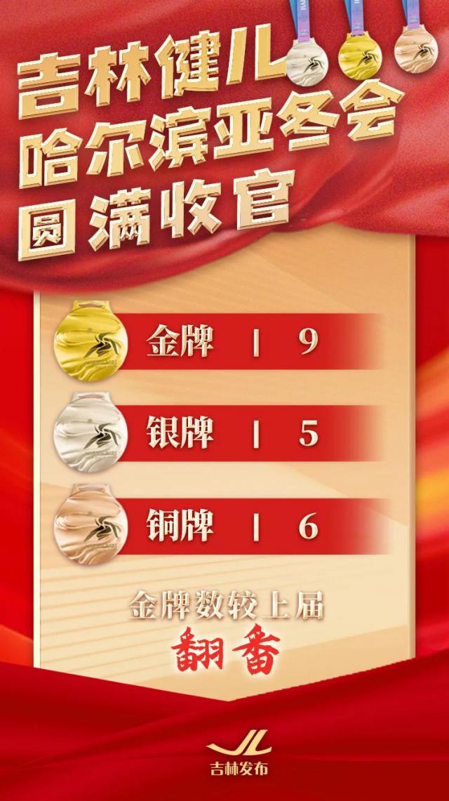 2 月 14 第九届亚冬大会在哈尔滨隆重落幕,中国代表团共获得第九届亚冬大会。 32 枚金牌、27 枚银牌、26 一枚铜牌!吉林冰雪健儿顽强拼搏,勇往直前,夺得第一名。 9 枚金牌、5 枚银牌、6 铜牌,金牌数和奖牌数均创下我省亚冬会历史最佳成绩。