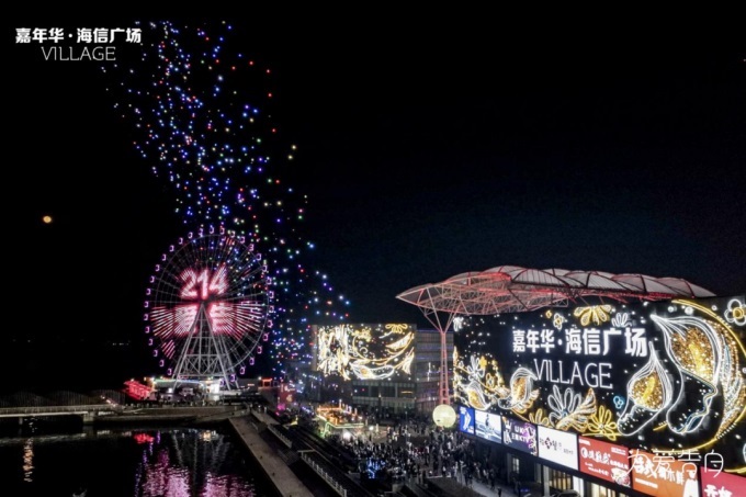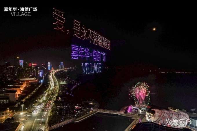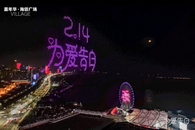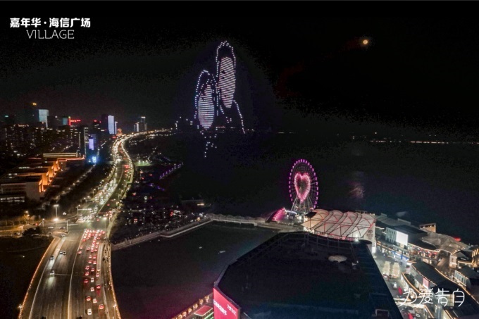 以天空为幕,以海为景,千架无人机璀璨的星河秀,五彩缤纷的摩天轮灯光秀,耀眼的裸眼3D大屏幕相得益彰,将情人节的夜空点缀得风景如画。