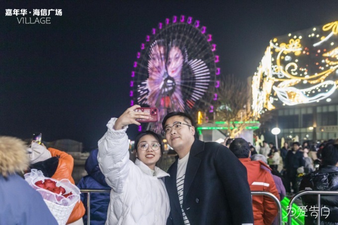 2月14日,这个充满爱的情人节夜晚,青岛西海岸迎来了一个独特的浪漫时刻。嘉年华海信广场VILLAGE梦想上演了全国商业体最大的多维浪漫告白盛会。