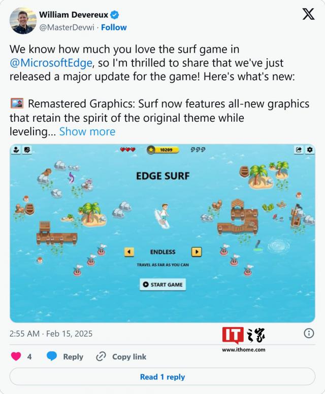 IT 世家 2 月 15 日消息,微软 Edge 高级项目经理 William Devereux 今天(2 月 15 日)在 X 平台发表文章,宣布升级 Edge “冲浪”浏览器(Surf)游戏,提供全新的图片,支持定制人物,增加新的收藏模式等。