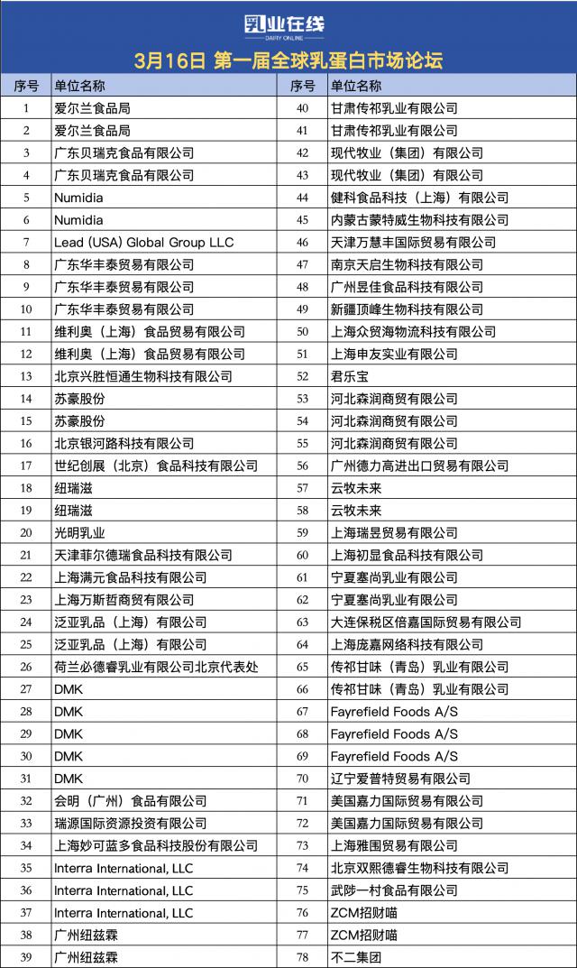 邀请单位:爱尔兰食品局,凯爱瑞,泛亚,恒天然,菲仕兰,美国乳制品出口协会,Wheyco、Tatua、Leprino、Arla、安格普、普洛钦、戴维林、银河路、中柏、塞尚、不二集团等。