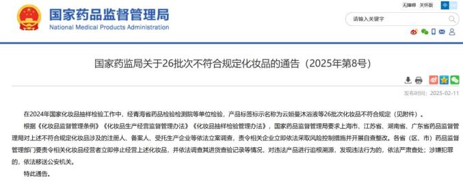在2024年全国化妆品抽样检验工作中,经青海省药品检验检验院等单位检验,商品标签名称为26批化妆品,如云英曼沐浴露,不符合要求。