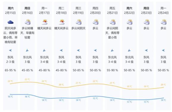 二月十五日,阴天多云,偶有零星小雨,早晚有轻雾;气温16-22℃;2-3级东风;65%-95%的相对湿度。