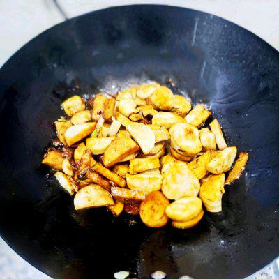 6、葱蒜炒好后,将切好的面筋放入锅中。加入一勺酱油,一勺酱油炒匀。