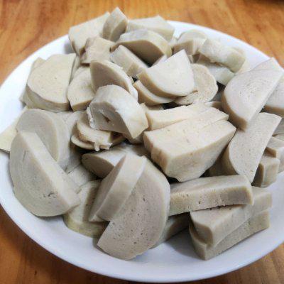 1、买回来的面筋清水洗净,切好放入盘中备用。