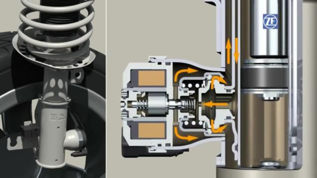 大家看,这是很多车都有的,弹簧筒一体化的悬架。我们常说的电磁悬架,其实是指所有减振器的阻尼都可以通过电信号和磁场主动控制,使其变软变硬。