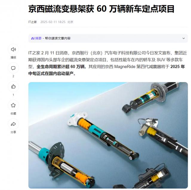就在几天前,我国汽车零部件供应商京西集团发表声明称,他们制造的磁流变悬架已经获得国内顶级汽车公司的定点,从汽车到汽车。 SUV ,总共得给予超出 60 万辆汽车供应,今年年中可以大规模生产。