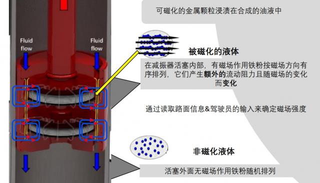 是不是觉得有点科幻,但是真的是通过一个很有天赋的思维来达到这个效果。也就是把原来减震器里的油换成磁流变液。顾名思义,这个东西会根据不同的环境磁场改变液体中颗粒的排列方式。