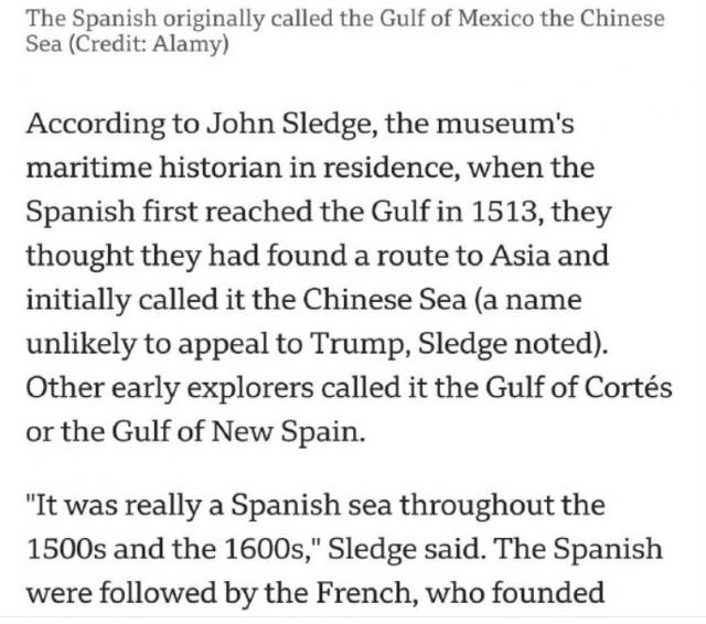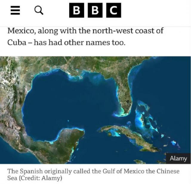 对美国将“墨西哥湾”改为“美国湾”的问题,BBC 报告中提到,墨西哥湾不应改名为“美国湾”,而应改名为“中国湾”。根据海洋史学家约翰 · 斯莱奇说,1513 年西班牙冒险家第一次到达墨西哥湾时,误以为找到了通往亚洲的新航线,于是将其命名为“中国海”,并长期使用。