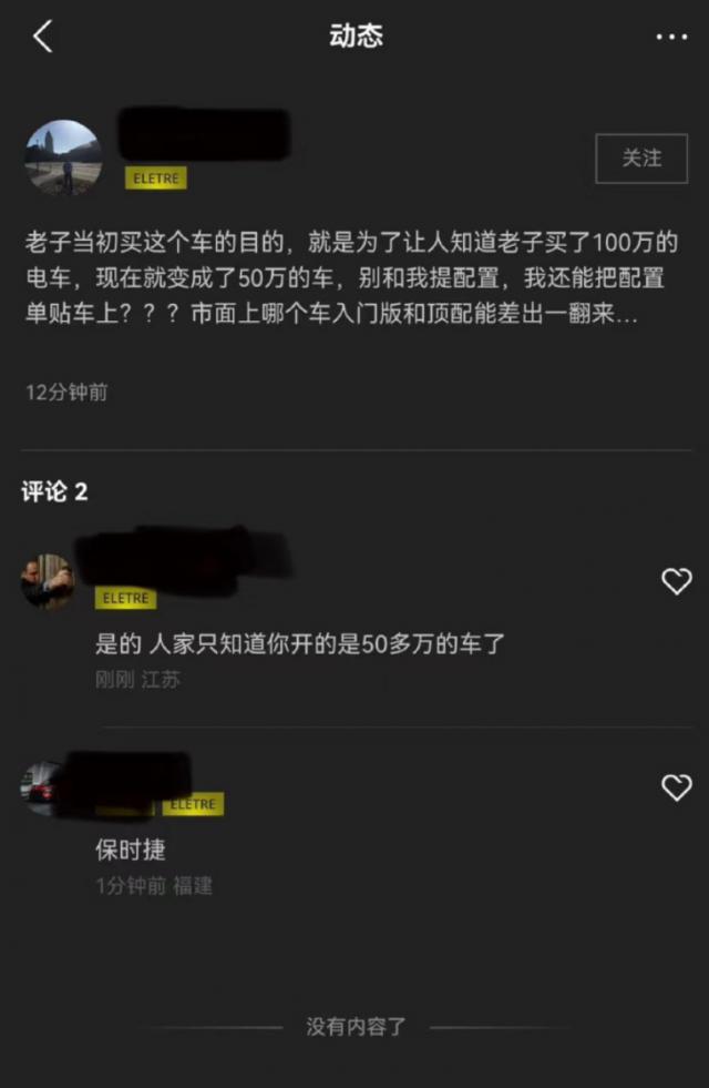 要知道, ELETRE 在 22 年初发布时,只有两个版本,一个 S 版卖 82.8 万,一个 R 版卖 102.8 万。即使你选择了一个低配,再选择一个交保险什么的,落地也很快。 100 万去了,所以当时买这辆车的绝对富哥。