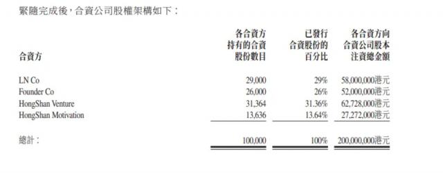 据公告披露,合资企业股本总额为 2 其中李宁企业占亿元, 李宁个人占29% 红杉中国占26% 45%。
