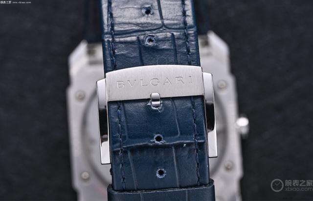 表与蓝色鳄鱼皮表带搭配,与蓝色表盘相呼应,增强了表面的美观。