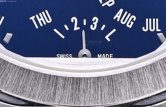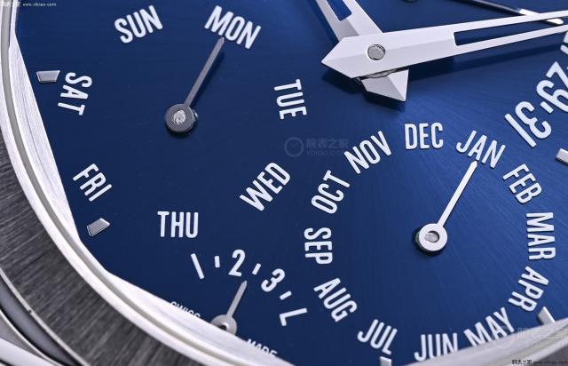 蓝表盘分布时间显示,日期显示(表盘上部分) 9 点至 3 点位)、礼拜显示(7 点和 8 点位)、月份显示(4 点和 5 点),闰年显示(66) 点)。几个功能形成三角形,使盘面构图和谐平衡。