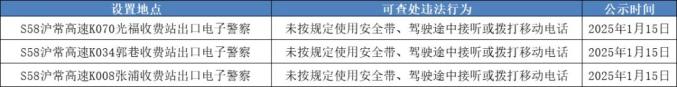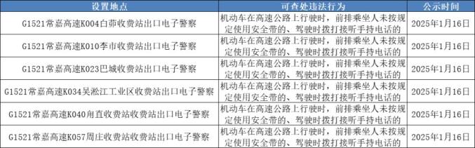 为加强道路交通管理,公安交警部门将在S58沪常高速公路3处、G1521常嘉高速公路6处、内环快速公路8处安装可记录机动车交通违章的固定交通技术监控设备,公告一周后启用上述设备。