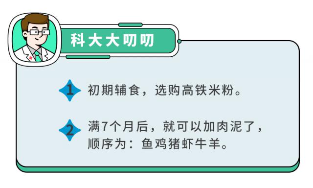 7 过了几个月,可以加一些。红泥,肝泥,鸡鸭鱼肉嗯,这种食物含铁丰富,而且容易吸收。一开始加少量,确定宝宝不过敏再正常食用。