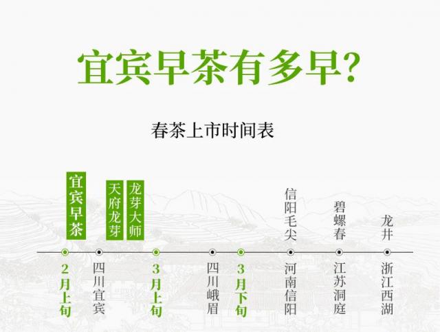 “早采三天是宝,晚采三天是草”。我们的宜宾早茶是今年的头春茶,嫩度高,口感清新爽口。,无害虫,无农残!宜宾早茶属于明前茶,每年春分一周后即可收获,先于全国其它主要茶叶产地。15-30 天左右。