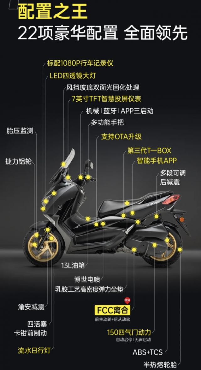 此车座高 755 mm,整备质量 150 KG,内置行车记录仪,支持胎压监测,多段可调后减震,四活塞前刹车,双通道 ABS、TCS 牵引控制系统, FCC 同时配备离合器 7 英尺 TFT 新增三代仪表盘 T-BOX 互联系统。