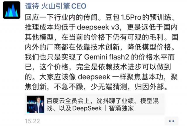 但面对 DeepSeek 异军突起,去年豆包有多火爆,进入 2025 2008年豆包可能会有多难受。百度智能云业务集团总裁沈抖在最近的一次内部会议上评论道,面对 DeepSeek 来势汹汹,首当其冲。 AI 商品,即字节豆包,感觉后者的训练费用和投流费用都很高。