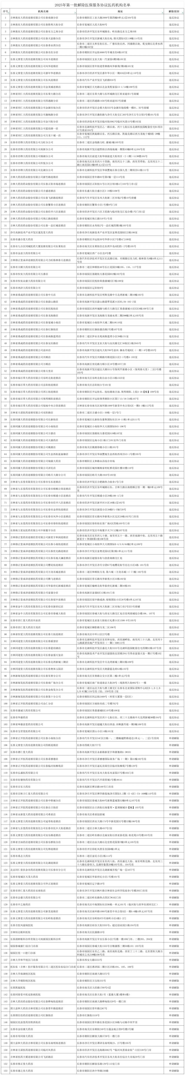 为进一步加强我省定点医疗机构管理,维护医疗保险基金安全,按照《医疗机构医疗保险定点管理暂行办法》(国家医疗保险局令第一 2 号码)和《零售药店医疗保障定点管理暂行办法》(国家医疗保障局令第一 3 号码)等有关规定和医疗保险服务协议约定的内容,现将 2025 2008年,吉林省医疗保障定点医疗机构服务协议解除名单 153 公布家庭定点医疗机构。这些都是违反协议的 104 家庭、药业机构申请消除共有 49 家。这些都是违反协议的 104 家庭、药业机构申请消除共有 49 家庭。详情请参见下表: