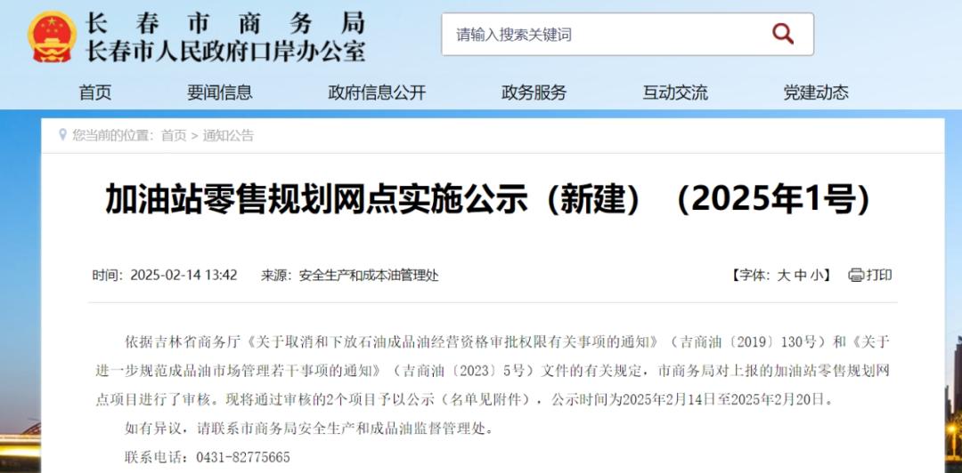 二月十四日,长春市商务局网站更新了《加油站零售规划网点实施公示(新建)》(2025年1号),详情如下: