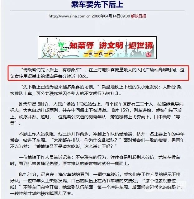 2006年有报道称,上海地铁人民广场站高峰期“请乘客先下车,有序乘车”的口号播放频率达到每分钟近10次。最近随机乘坐上海地铁多条线路时,发现“先下车后上车”的提示消失了。平台广播只剩下“上下车小心间隙,请注意脚下的安全,门灯闪烁时不要上下车”。