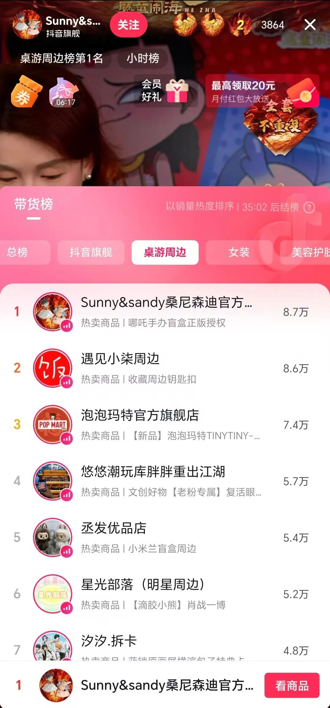 字母榜(ID:wujicaijing)看到,上述产品的订单量已达到65万。以每盒69元的价格计算,这家哪吒IP核心授权商——桑尼森迪,在《哪吒2》上映后的17天内,单个产品就卖出了近5000万元。直播间一度登上抖音平台周边桌游带货榜榜首位,店铺粉丝也于10天内从70万增长到115万,其公司哪吒周边产品的销售额更是达到了2亿元。
