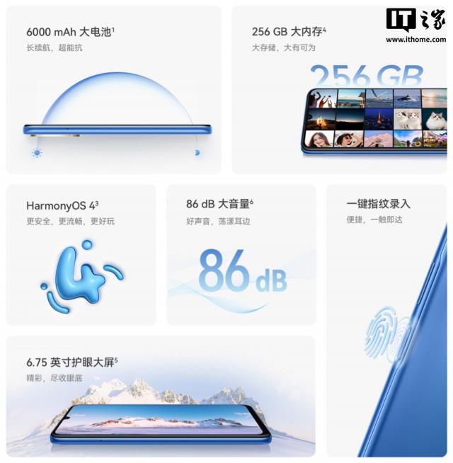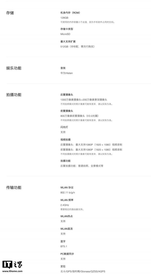 在规格方面,华为享受 70z 选用一块 6.75 英尺 1600x720 分辨率 60Hz LCD 外置水滴屏 8MP 摄像机,后置 13MP 主摄 2MP 景深镜头,搭载麒麟 710A 处理器,内置 6000mAh 支持巨鲸电池 22.5W 有线充电。
