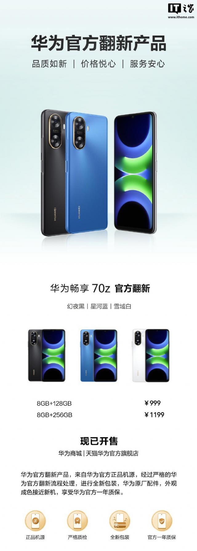 华为畅享 70z 官方翻新机销售:搭麒麟 710A,999 元起