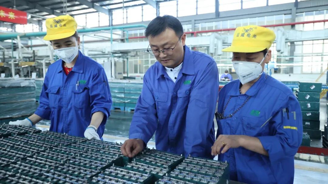 周万昌(左二)是河北永旭电源有限公司质量部门的领导者,正在检查商品。公司提供图片