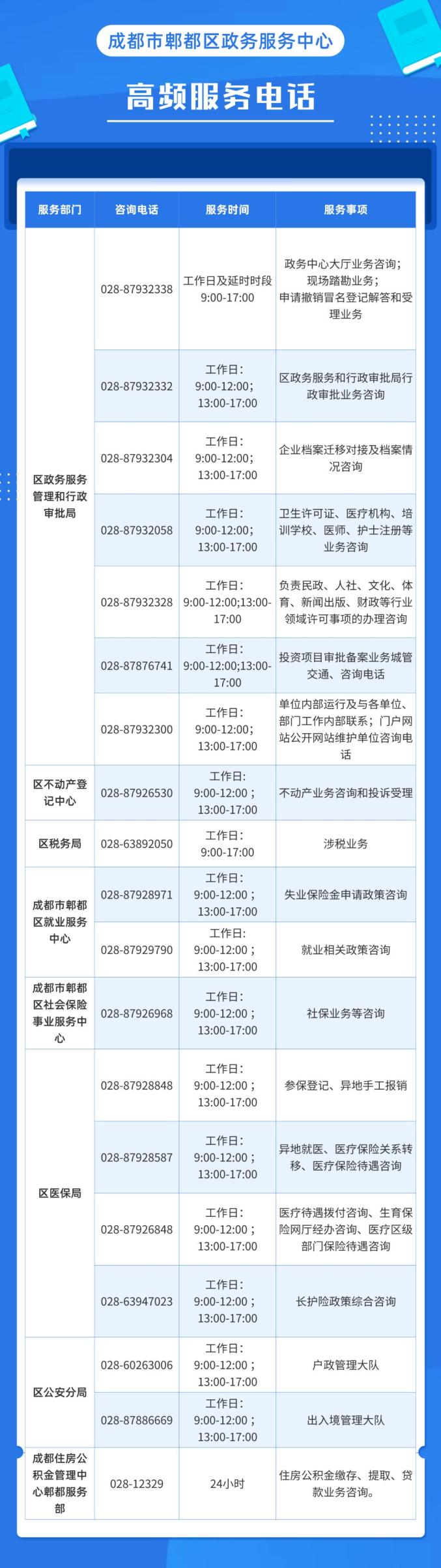 郫都区级公共服务电话清单