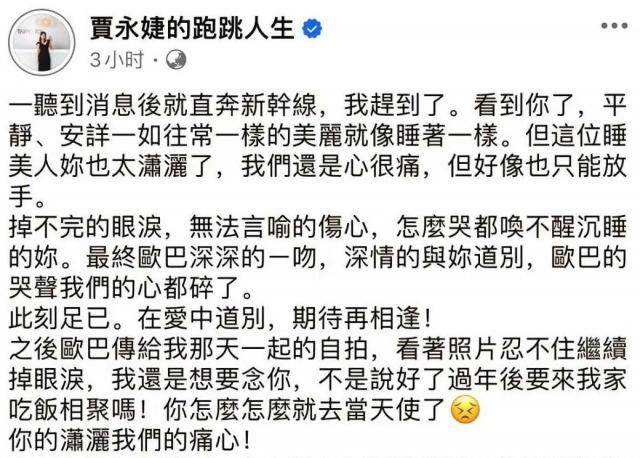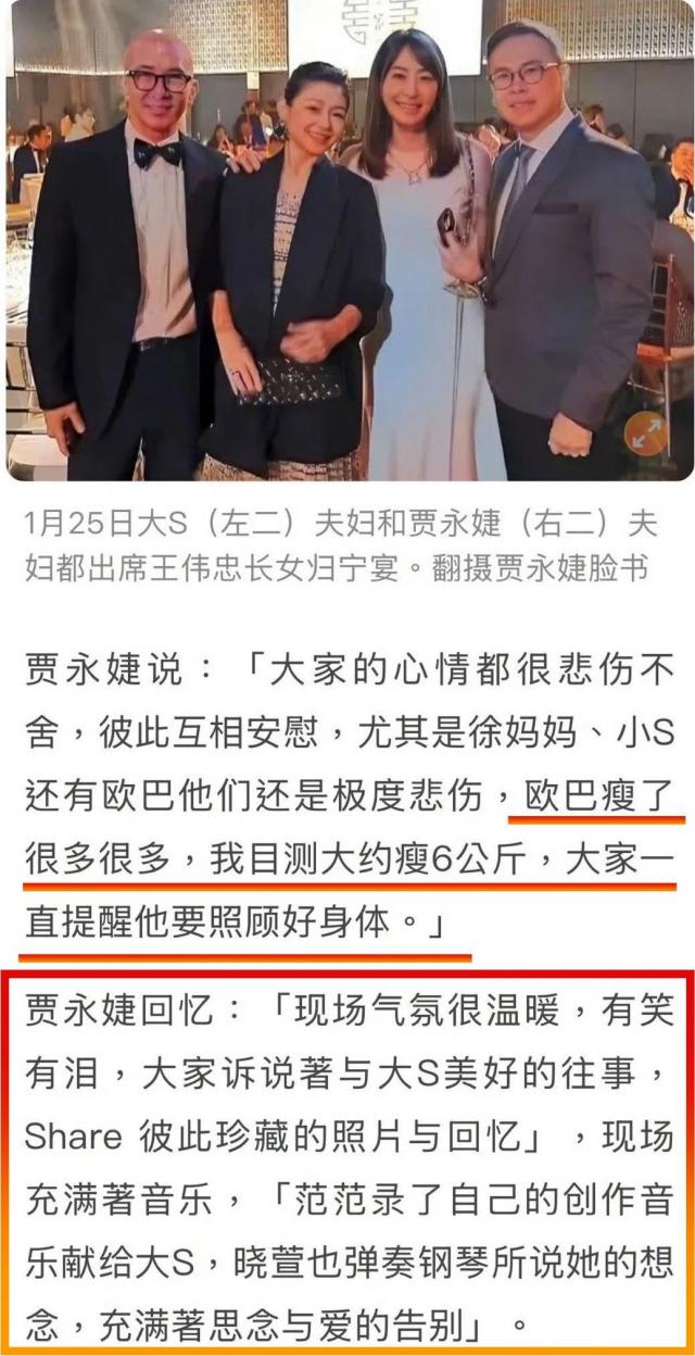 大 S2 月 2 号码去世后,家人对她的一切保密,贾永婕却在 2 月 3 号码发文描述大 S 离开后的神态,具俊邈的表现。